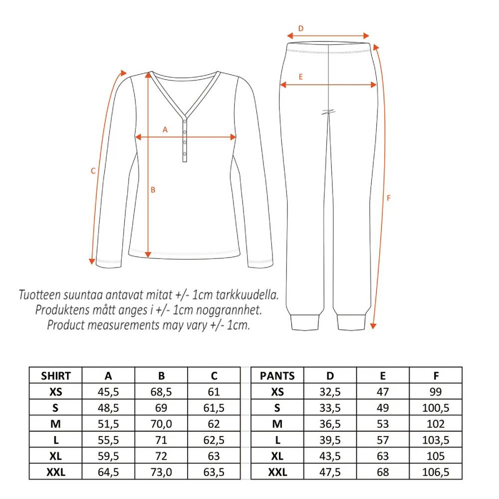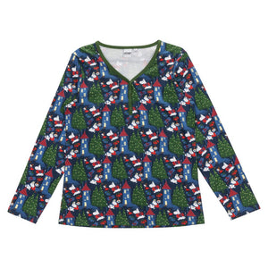 Comfortable slim fit two-piece Moomin Christmas pyjamas. The feminine fit shirt has long sleeves and a V-neckline with snap buttons. The pants have long legs and elastic waistband. Made from cotton.