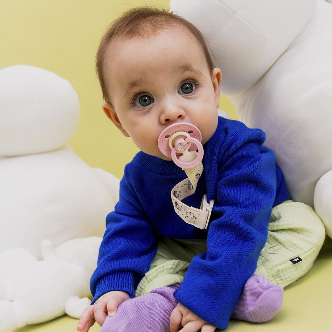 The BIBS x Moomin Loop Pacifier Clip brings everyday practicality together with the playful magic of the beloved Moomin characters. Designed to keep pacifiers within reach, it features a smart one-handed clipping mechanism and a flexible silicone ring that fits all BIBS pacifiers and most others. Perfect for sparking smiles and adding a little magic to daily parenting moments. A functional must-have – now with a touch of storybook charm. Age 0+.