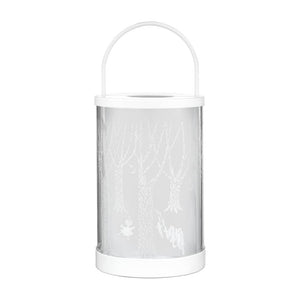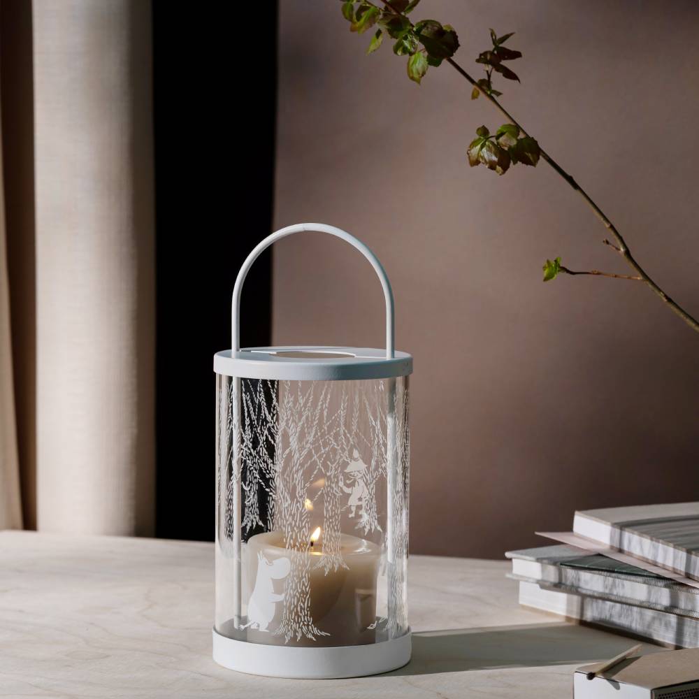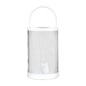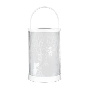 Moomin lantern of clear glass with white metal frame. The Moomin by Muurla In the Woods lantern has a sturdy metal frame and a cylinder shape glass part. This lantern can be used both indoors and outdoors. Hand wash only. Total height 26cm. Size Ø 12 cm / h 26 cm.