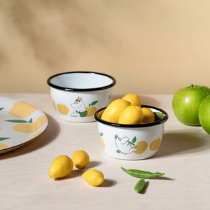 Join Moomintroll and his friends for a joyful day of apple picking. Moomin enamel bowl in size of 3 dl. Classic white enamel combined to fresh and bright colors gives a retro feeling to this new Moomin by Muurla collection, Joyful Apples. Mix and match different pieces to brighten up your kitchen or pack them all with you for a lovely picnic. Muurla's enamelware consists of a carbon steel core that carries a double coating of enamel. Being durable and light, enamel products are perfect for both indoor and outdoor use. Diswasher safe. Do not use in microwave oven.
