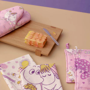 Bring some love to your kitchen experiments! On the pink oven mitt, you can spot the sweethearts Moomintroll and Snorkmaiden. Moomin Arabia oven mitt 15x34cm. Material: 100% cotton, filling 70% cotton & 30% polyester. Machine wash at 40°C. Designed in Finland. Made in India.