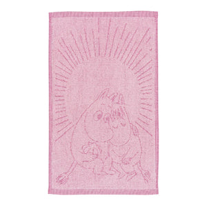 Enjoy the soft coziness of a pink Moomin hand towel featuring the sweethearts Moomintroll and Snorkmaiden.