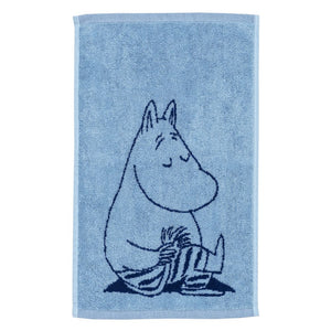 Enjoy the soft coziness of a navy Moomin hand towel featuring the curious fellow Moomintroll. Moomin Arabia hand towel 30x50 Moomintroll navy. GOTS.