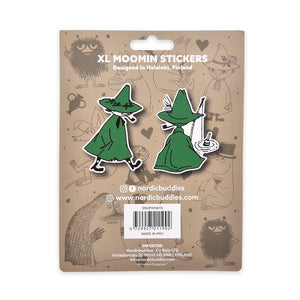 Snufkin Fishing XL Stickers 2-pack by Nordicbuddies. Packaging size 15 x 20cm / Sticker sizes 14-16cm. Material 100% paper. Made in China. © Moomin Characters™.