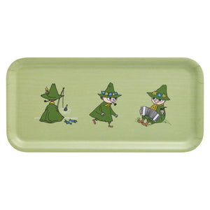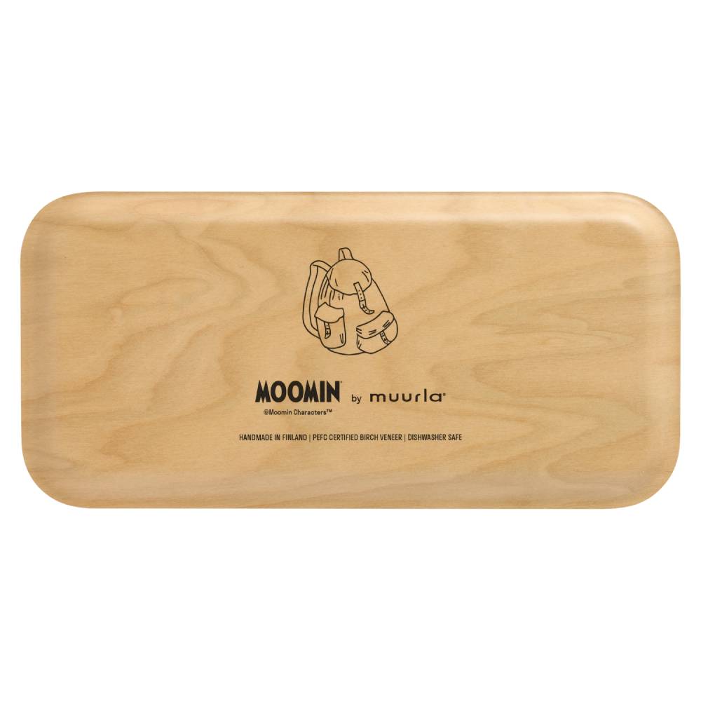 Snufkin green tray in size 27 x 20 cm. All Muurla trays are handmade in Finland out of birch veneer, with protecting lamination. Dishwasher safe.