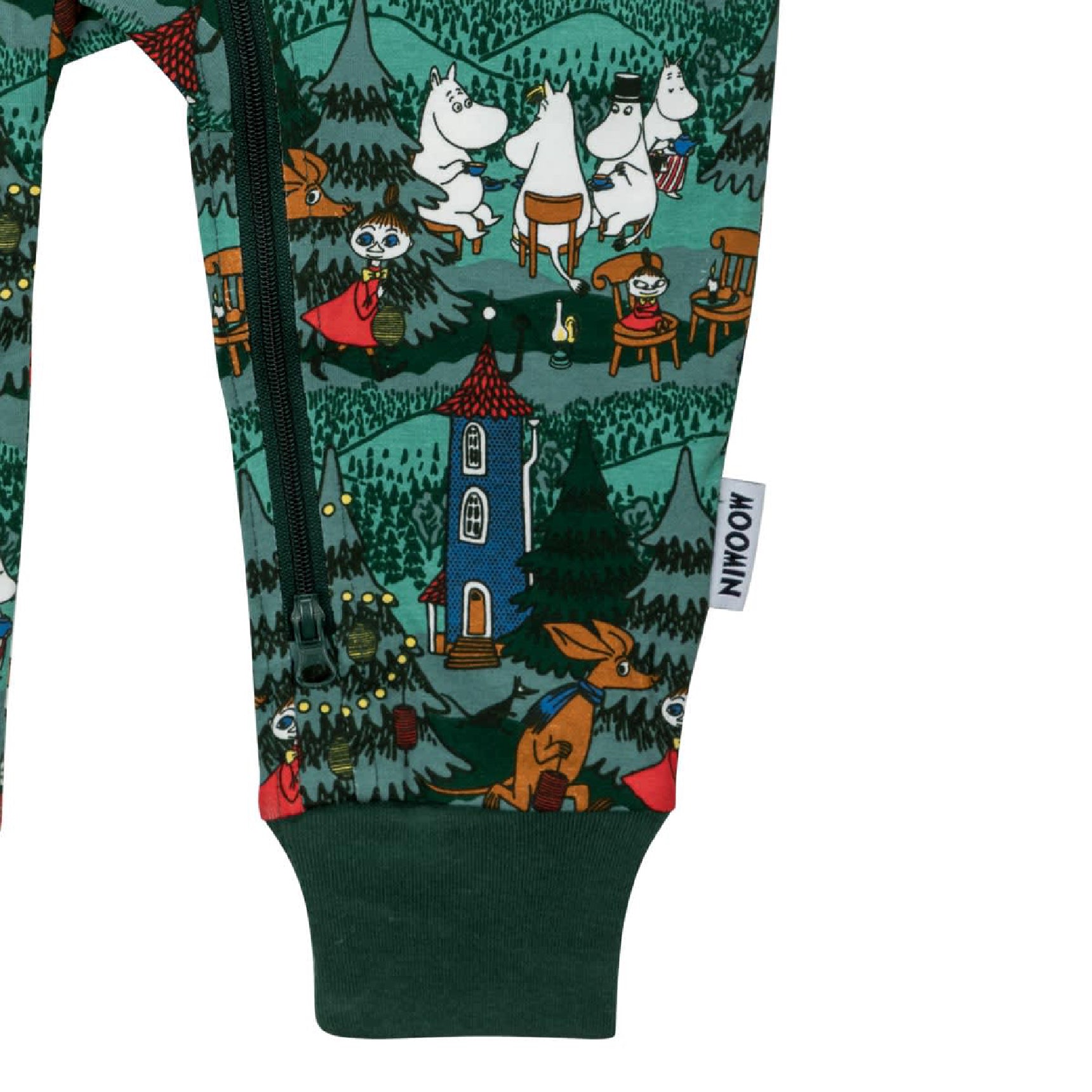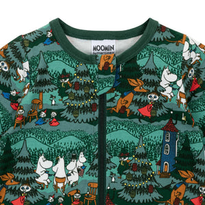Moominvalley is a good place to live. In the middle there is the Moominhouse,a good place to leave for an adventure and return. The Moomin family is having a gathering in the garden, with Sniff and Little My. Life is good at the home yard and away! Green-coloured babies’ long-sleeved pyjama with a two-way zipper closure, long sleeves and long legs with elastic trouser cuffs. The Moomin pyjama has a print filled with the hustle and bustle of the Moominhouse yard. Made from comfortable and ecologic single jersey cotton. Care instructions: 40 °C – Wash inside out with similar colours, iron on reverse side, do not tumble dry