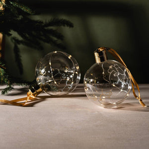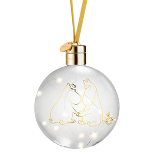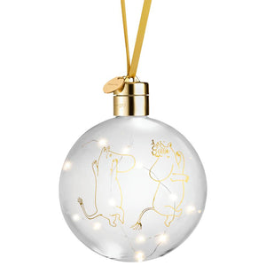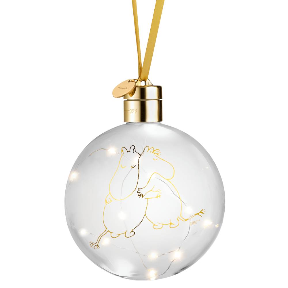 Battery operated Moomin decoration bauble with LED light string. The Moomin 80 glass bauble includes a satin ribbon for hanging and a light strip with 10 LED lights inside the glass. The bulbs cannot be replaced. Bauble is battery powered with 2pcs of CR2032 lithium batteries (not included). On-off switch. Indoor use only. Diameter 11cm.