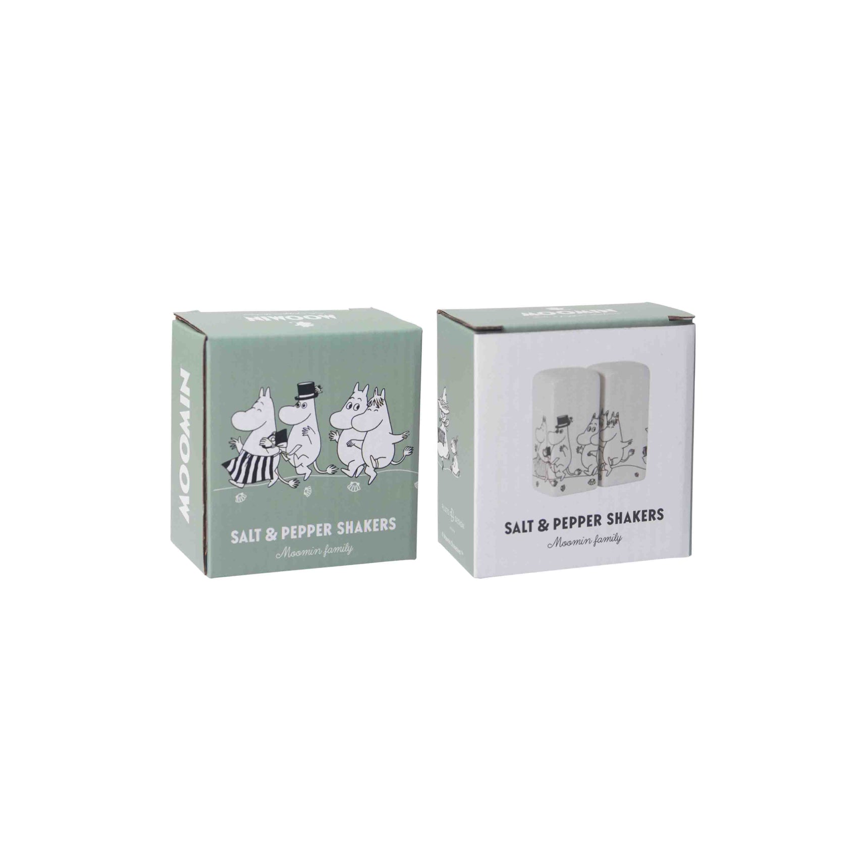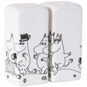 The Moomin family is known for their open-hearted hospitality, by welcoming many friends and creatures into their home as if they were family. This cute set of ceramic salt and pepper shakers has a black and white illustration of the Moomin familyskipping.
