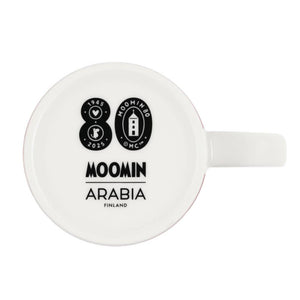 Beautiful red Moomin Arabia mug 0,3L, Festive Moments. Material: vitroporcelain. Machine washable, oven and microwave safe. Designed in Finland. Made in Thailand. The mug features a special Moomin 80 backstamp.