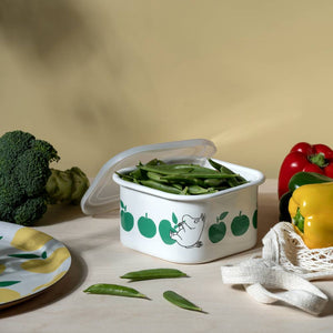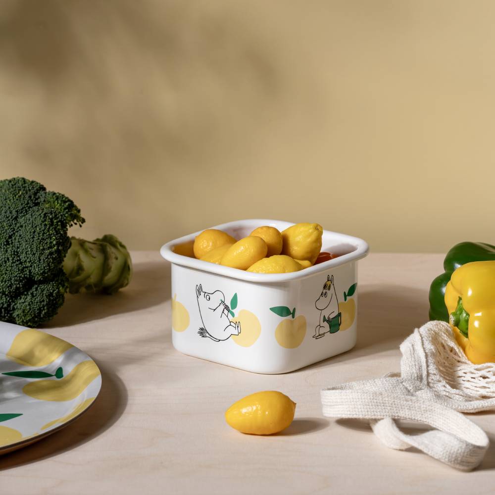 Classic white enamel combined with fresh and bright colours to give a retro feeling to this new Moomin by Muurla collection, Joyful Apples. Brighten up your kitchen or pack them all with you for a lovely picnic. Joyful Apples enamel jars are perfect for storing snacks and any foodstuff. They can also be used as a lunch box. The plastic lid keeps the jar sealed and your snacks fresh.
