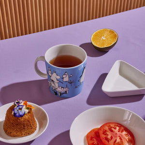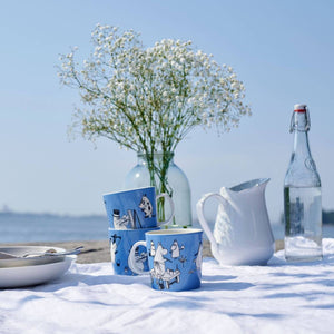 Arabia's Moomin mug Blue from 1990, now available in special 0.4 L size! One of the original drawings is from the logo Tove Jansson drew for the cover of the comic strip books. Other original artwork for the mug is from Tove Jansson’s comic strip #20 Moomin under Sail (1959) the novel Moominpappa at Sea (1965) and comic strip #31 Artists in Moomin Valley (1962).