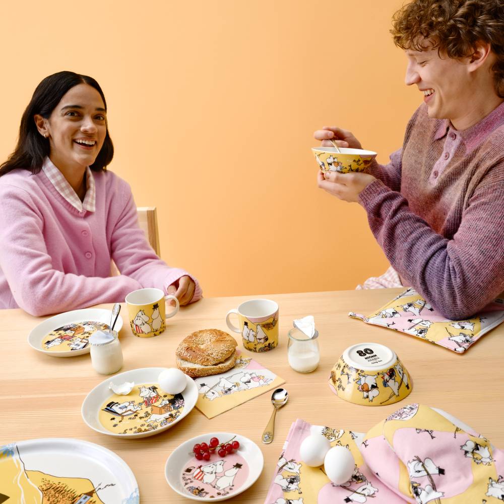 Family Time features illustration of the Moomin family’s happy reunion in front of the Moominhouse is based on Tove Jansson’s comic Moomin and Family Life from 1955. In this story, Moominmamma and Moominpappa rescue Moomintroll from the waves of the sea. Soon, they realize Moomintroll is their long-lost son, and the family can return home together. Complementing this story, the other Family Time items show the reunited family spending time together in leisurely coziness and exploring the possibilities of the beautiful Moominvalley, where horse chestnuts are in bloom.Moomintroll nearly drowns. Luckily, Moominmamma and Moominpappa rescue him. While sipping a drink, he recognizes the mug from his childhood, and they realize he is Moominmamma’s and Moominpappa’s long-lost son!