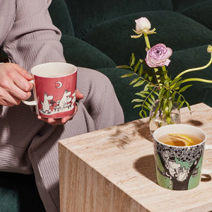 Arabia's Moomin mug Rose from 1990, now available in speciaL LARGER 0.4 L size! The artwork for the mug is based on Tove Jansson’s comic strip “Moomin Falls in Love” (1956). Update your collection with the Green special-sized mug as well!