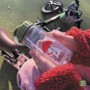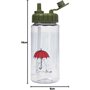 This transparent water bottle is durable and thanks to its size it is suitable for little hands. The screw top lid makes filling the bottle quick and easy. It also has a built-in straw that unfolds and folds for transport. The drinking tip is always clean. Convenient! The bottle has a green lid and a clear bottom with a fun illustration of Moomintroll walking in the rain with his big red umbrella. Dimensions: 6 x 6 x 16 cm