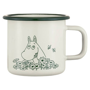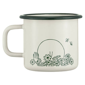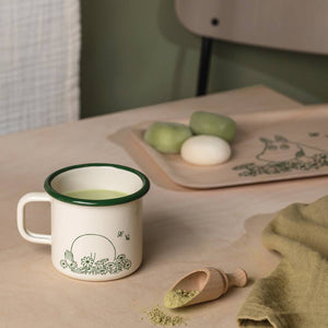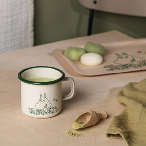 This durable, lightweight Moomin enamel mug features a soft off-white background and a charming green illustration, finished with a matching green rim. A delightful companion for everyday moments –perfect to take along on a boat trip, camping adventure, or simply enjoy at home. Do not use in a microwave oven. The surface of the enamel product may chip if dropped or struck. Dishwasher safe. Size 3.7 dl.