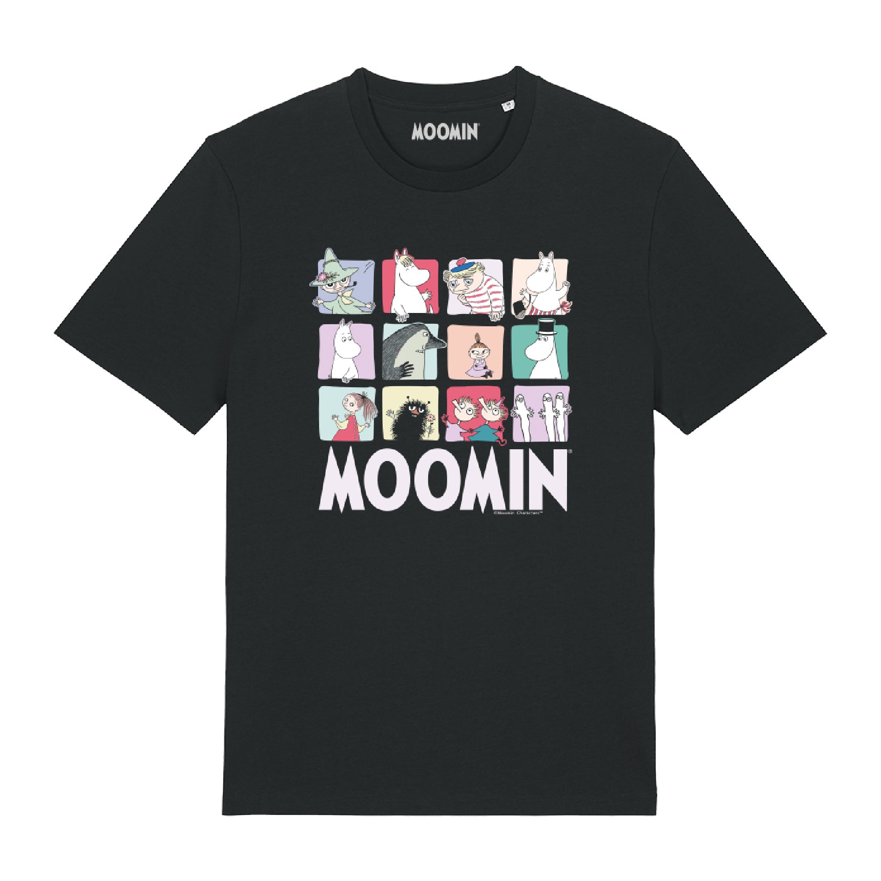 Dress to impress with this cool black high quality, organic fashion-cut t-shirt with a block print of 12 characters from Moominvalley to the front. The modernised, perfect-fitting unisex Moomin t-shirt, with 180gsm 100% organic cotton compact yarn fabric, provides the smoothest printing surface for decoration and features a deep and vibrant colour palette. Modern medium fit with set-in sleeve. 1x1 rib at neck collar. Inside back neck tape in self-fabric. Twin-needle topstitch at sleeve cuff and hem. Printed Moomin back neck label.