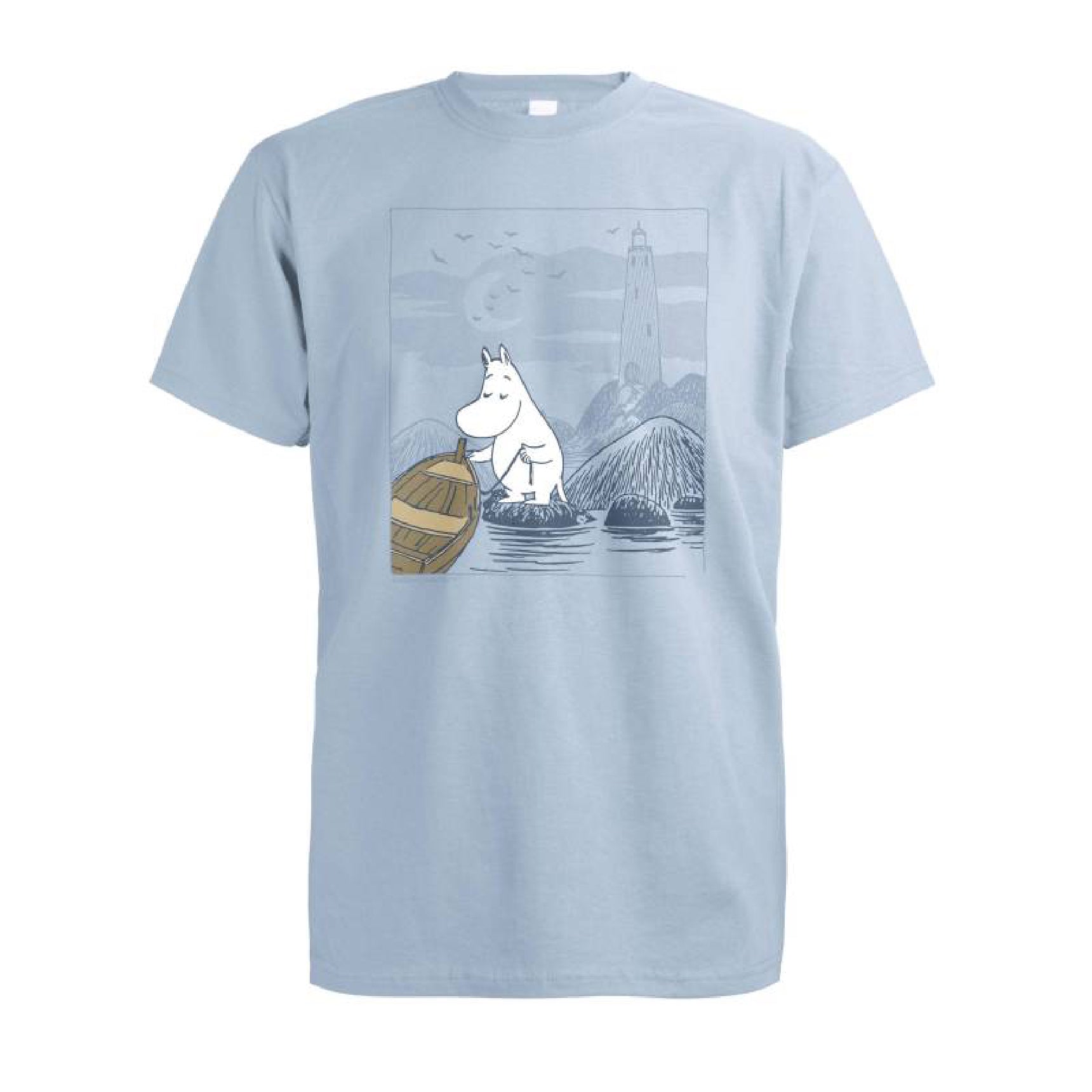 Light blue t-shirt for maritime enthusiasts with Moomintroll arriving at the lighthouse island. This soft organic cotton t-shirt has a comfortable unisex fit, suitable for both men and women.