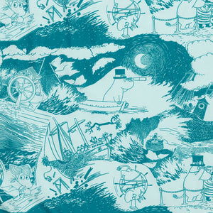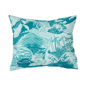 Moomin Arabia pillowcase 50x60 Sailing. Material: Organic cotton 100%, GOTS. Machine wash with similar colours inside out at 60°C. Washing is recommended before using the product. Shrinkage max 5%. Designed in Finland and made in Turkey.