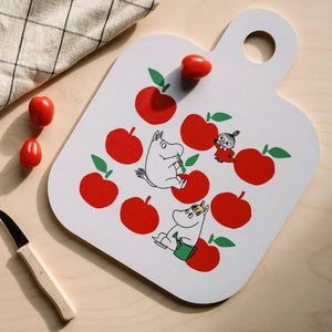 Join Moomintroll and his friends for a joyful day of apple picking. Mix and match different pieces to brighten up your kitchen or pack them all with you for a lovely picnic. Moomin chop and serve board in size 25 x 32 cm. Muurla chop & serve boards have a different illustration on both sides. You can use them both for the cutting and preparation of food and for the serving. Made in Finland out of birch veneer, with protecting lamination. Dishwasher safe.