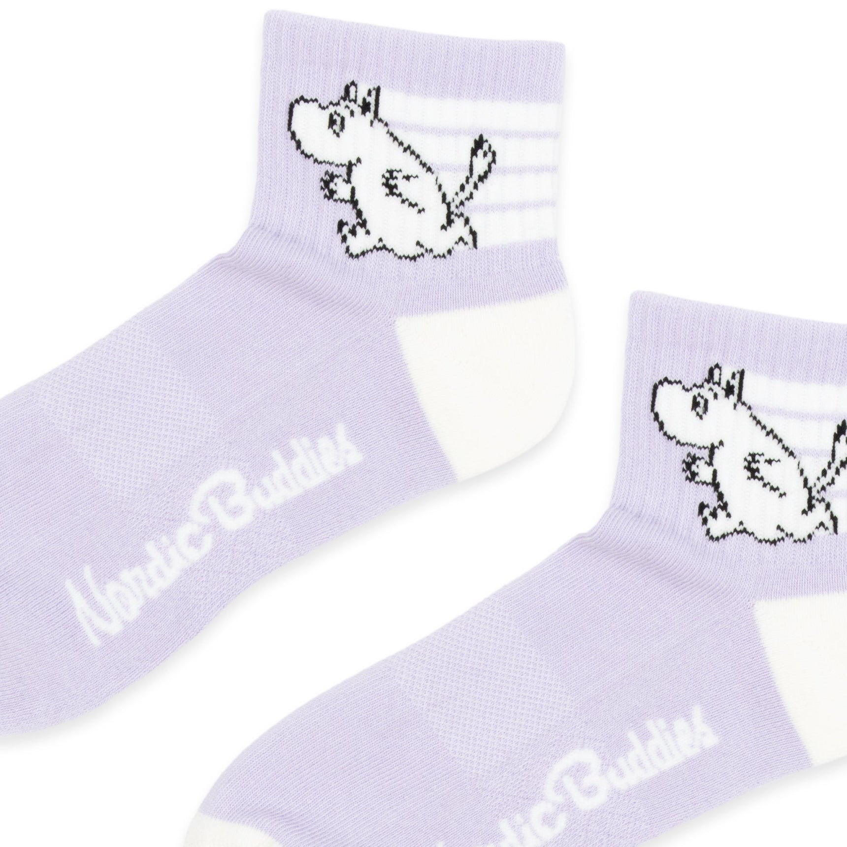 These cool lilac active ankle  socks have an illustration of  Moomintroll running. The socks have white detailing on the shank and heel. Ribbed cuffs keep the socks at the right height. Add a little bit of fun to your outfit by wearing these colourful and trendy Moomin socks instead of regular socks!