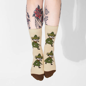 These adorable light beige socks feature Moominvalley's adventurer Snufkin. The socks have brown-coloured detailing on the shank and heel. Ribbed cuffs keep the socks at the right height. The socks are in size EU 36-42 (UK 4-8), but are also suitable for smaller and larger feet. The socks are made of a soft and flexible cotton-polyester-elastane combination. Take care of the socks by washing them at 30°C.