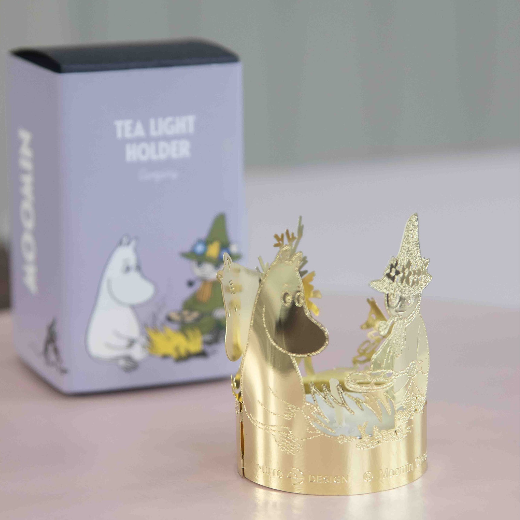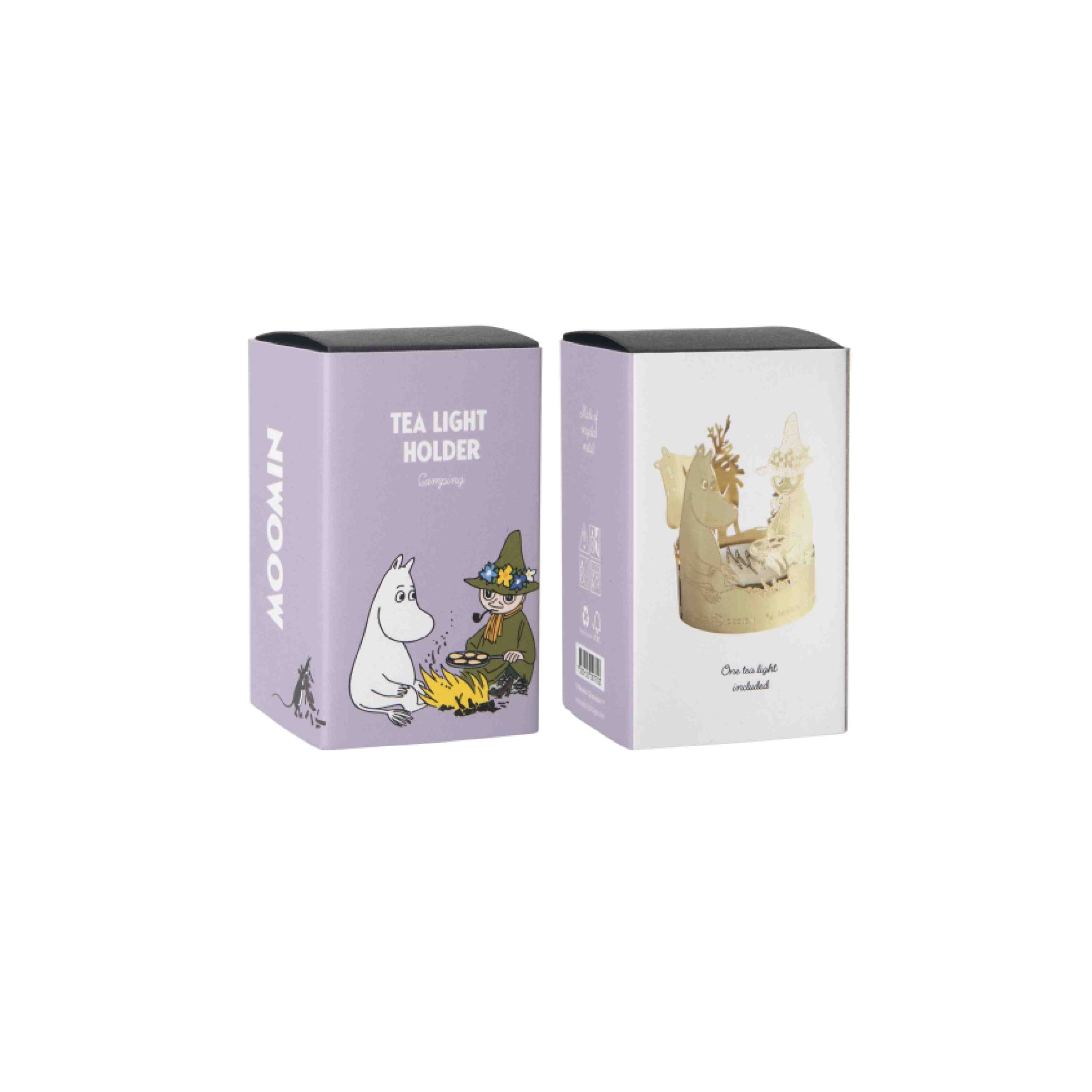 Spread some warmth and cosiness with this small Moomin tea light holder with a scene with Moomintroll and Snufkin by the campfire. The tea light holder holds one the light, and will cast a beautiful glow when the candle is lit. Comes in a cute gift box.