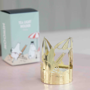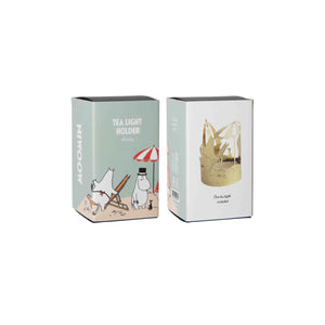 Spread some warmth and cosiness with this small Moomin tea light holder with a holiday scene with Moominmamma and Moominpappa on the beach. The tea light holder holds one the light, and will cast a beautiful glow when the candle is lit. Comes in a cute gift box.