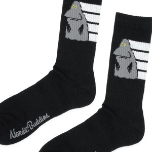 These cool black active socks with white details, features the Groke. Ribbed cuffs keep the socks at the right height. The socks have compression for better fit, are made from breathable material, have a thicker bottom layer, and ankle protection.The socks are in size EU 40-45 (UK 6.5-10), but are also suitable for smaller and larger feet. The socks are made of a soft and flexible cotton-polyester-elastane combination. Take care of the socks by washing them at 30°C.