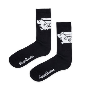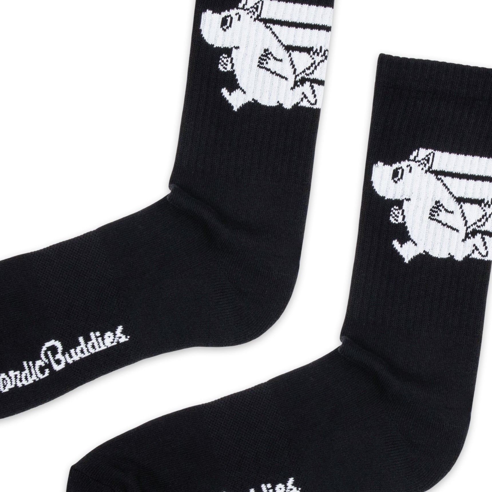 These cool black active socks features Moomintroll running. Ribbed cuffs keep the socks at the right height. The socks have compression for better fit, are made from breathable material, have a thicker bottom layer, and ankle protection.The socks are in size EU 40-45 (UK 6.5-10), but are also suitable for smaller and larger feet. The socks are made of a soft and flexible cotton-polyester-elastane combination. Take care of the socks by washing them at 30°C.