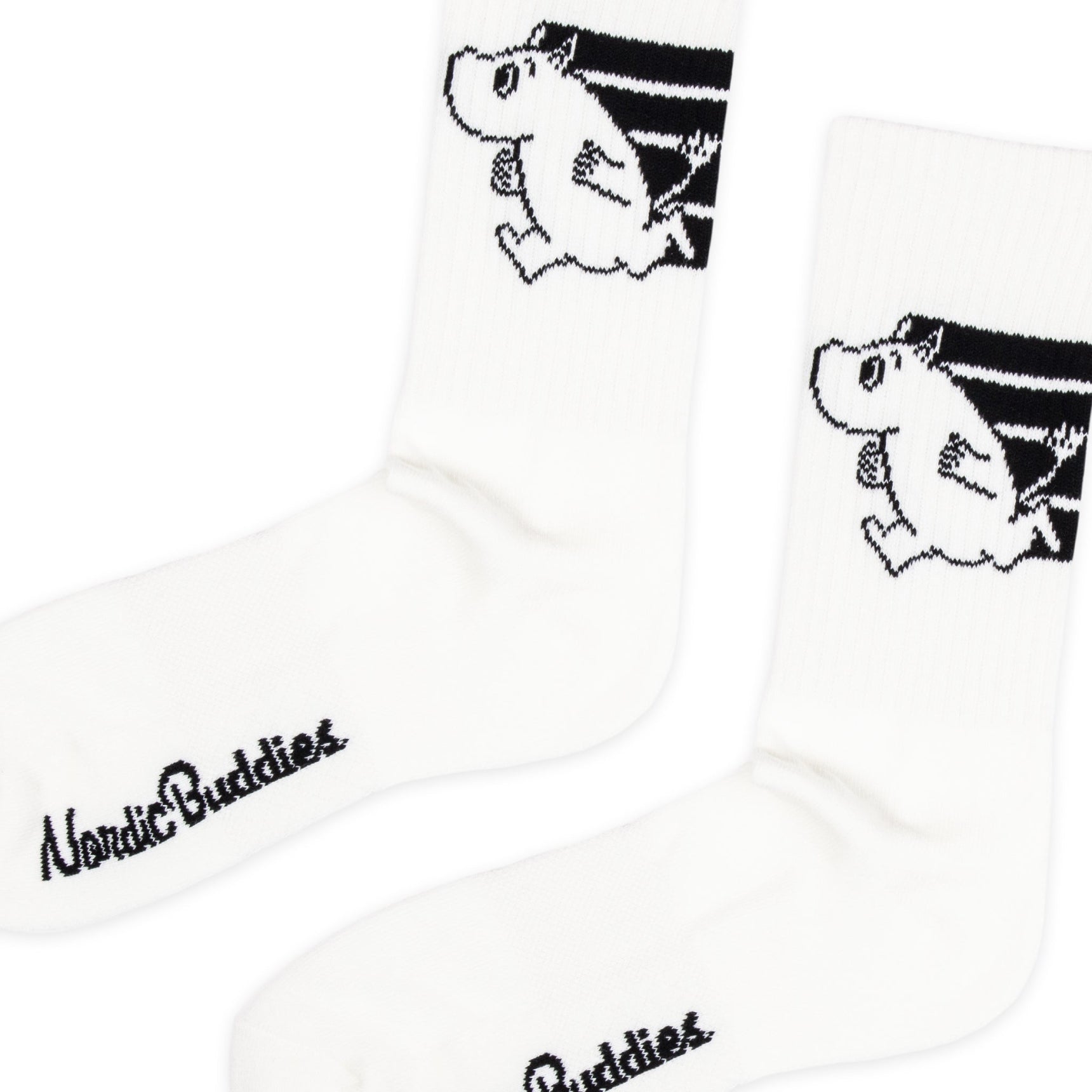 These cool black and white active socks features Moomintroll running.Ribbed cuffs keep the socks at the right height. The socks have compression for better fit, are made from breathable material, have a thicker bottom layer, and ankle protection.The socks are in size EU 40-45 (UK 6.5-10), but are also suitable for smaller and larger feet. The socks are made of a soft and flexible cotton-polyester-elastane combination. Take care of the socks by washing them at 30°C.
