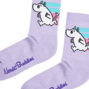 These cool lilac active socks features Moomintroll running. Ribbed cuffs keep the socks at the right height. The socks have compression for better fit, are made from breathable material, have a thicker bottom layer, and ankle protection.The socks are in size EU 36-42 (UK 3-8), but are also suitable for smaller and larger feet. The socks are made of a soft and flexible cotton-polyester-elastane combination. Take care of the socks by washing them at 30°C.
