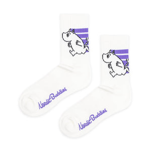 These cool white active socks features Moomintroll running, and has purple details. Ribbed cuffs keep the socks at the right height. The socks have compression for better fit, are made from breathable material, have a thicker bottom layer, and ankle protection.The socks are in size EU 36-42 (UK 3-8), but are also suitable for smaller and larger feet. The socks are made of a soft and flexible cotton-polyester-elastane combination. Take care of the socks by washing them at 30°C.
