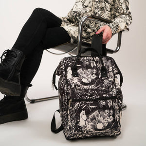 Thingumy and Bob have arrived to Moominvalley with the King's ruby, and everyone is excited and curious. Stylish black and white spacious backpack that isperfect for both school and work. You can easily fit a 14” laptop or a tablet, and the metallic frame t keeps the top open fully. This backpack is designed to be comfortable, durable, and easy to use in everyday life, and it features a plum-coloured print of a Moomin garden party.Measurements 25 x 38 x 16.5 cm