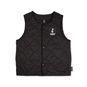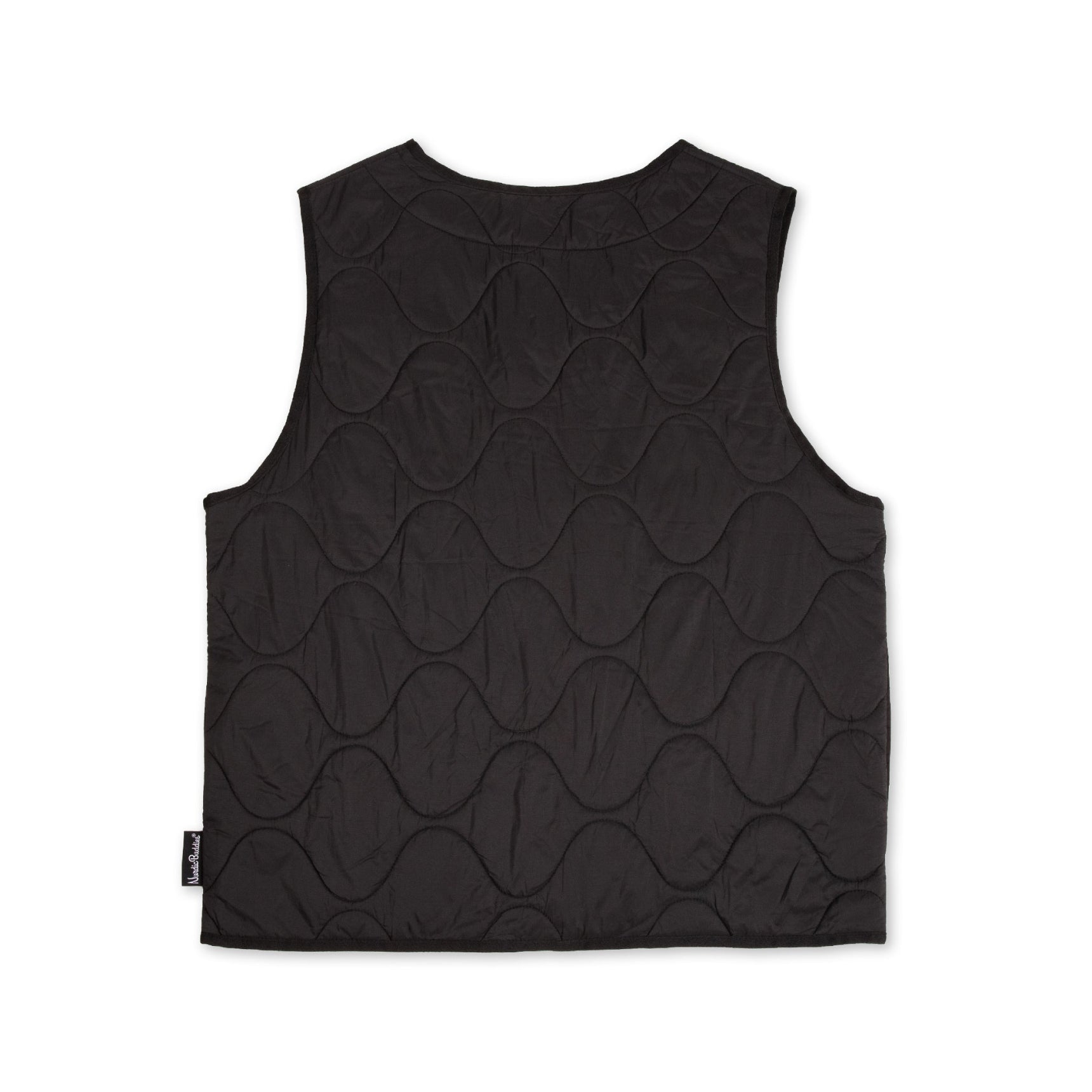 Stay warm this fall with this minimalist outerwear that is both cozy and stylish. It is an ideal layering piece for cooler weather. The vests come in neutral, earthy tones like black, beige, and green. The Moomin character illustrations are small and subtle, catering to fans who prefer a minimalist or mature aesthetic. As part of a fall/winter collection, the padded vests are well-suited for adding warmth without bulk. They can be worn over sweaters or under a coat. This black vest features a patch with Snufkin fishing. Materials: 100% Nylon & Polyester.