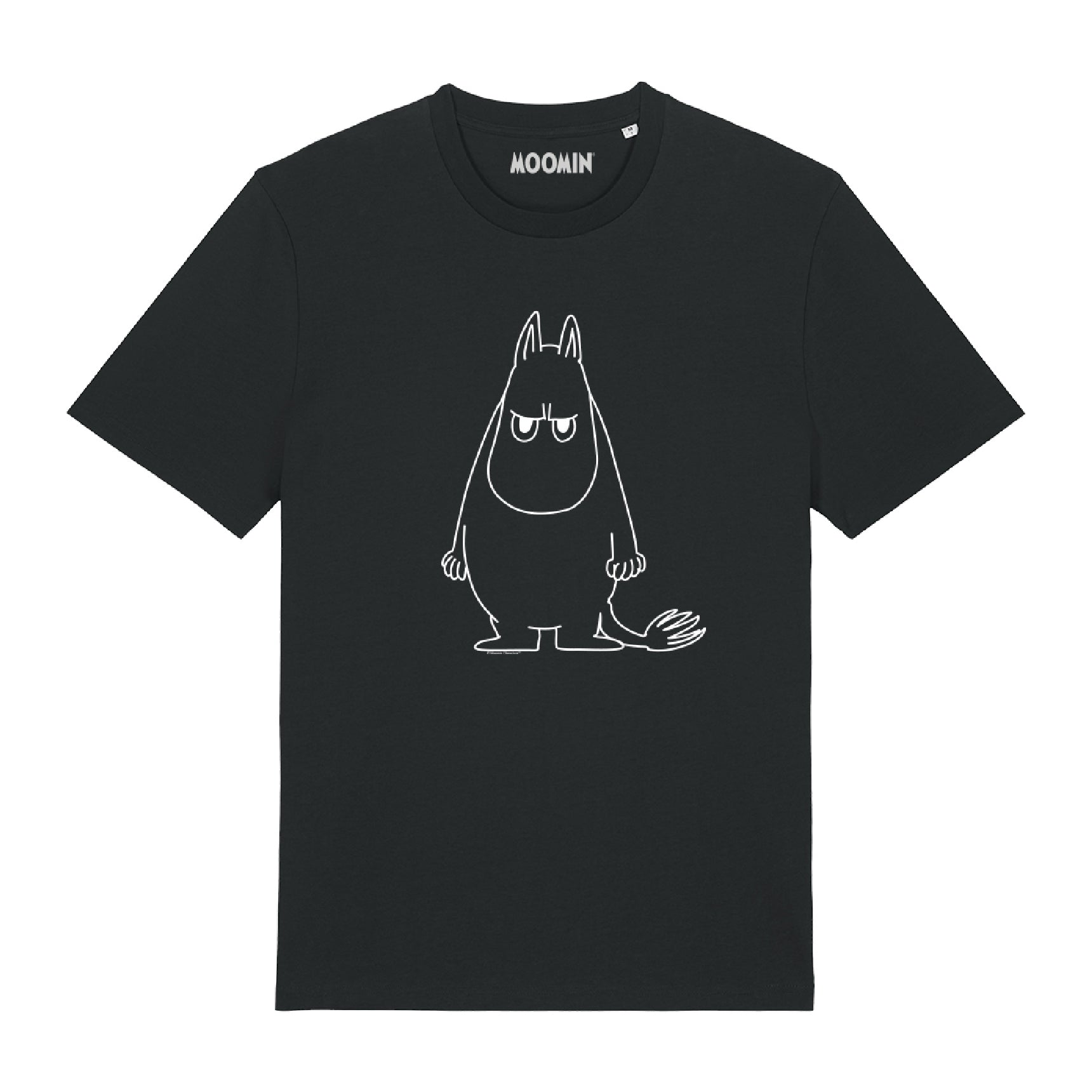 Dress to impress with this cool black high quality, organic fashion-cut t-shirt with a print of Moomintroll with an angry face to the front. The modernised, perfect-fitting unisex Moomin t-shirt, with 180gsm 100% organic cotton compact yarn fabric, provides the smoothest printing surface for decoration and features a deep and vibrant colour palette. Modern medium fit with set-in sleeve. 1x1 rib at neck collar. Inside back neck tape in self-fabric. Twin-needle topstitch at sleeve cuff and hem. Printed Moomin back neck label.