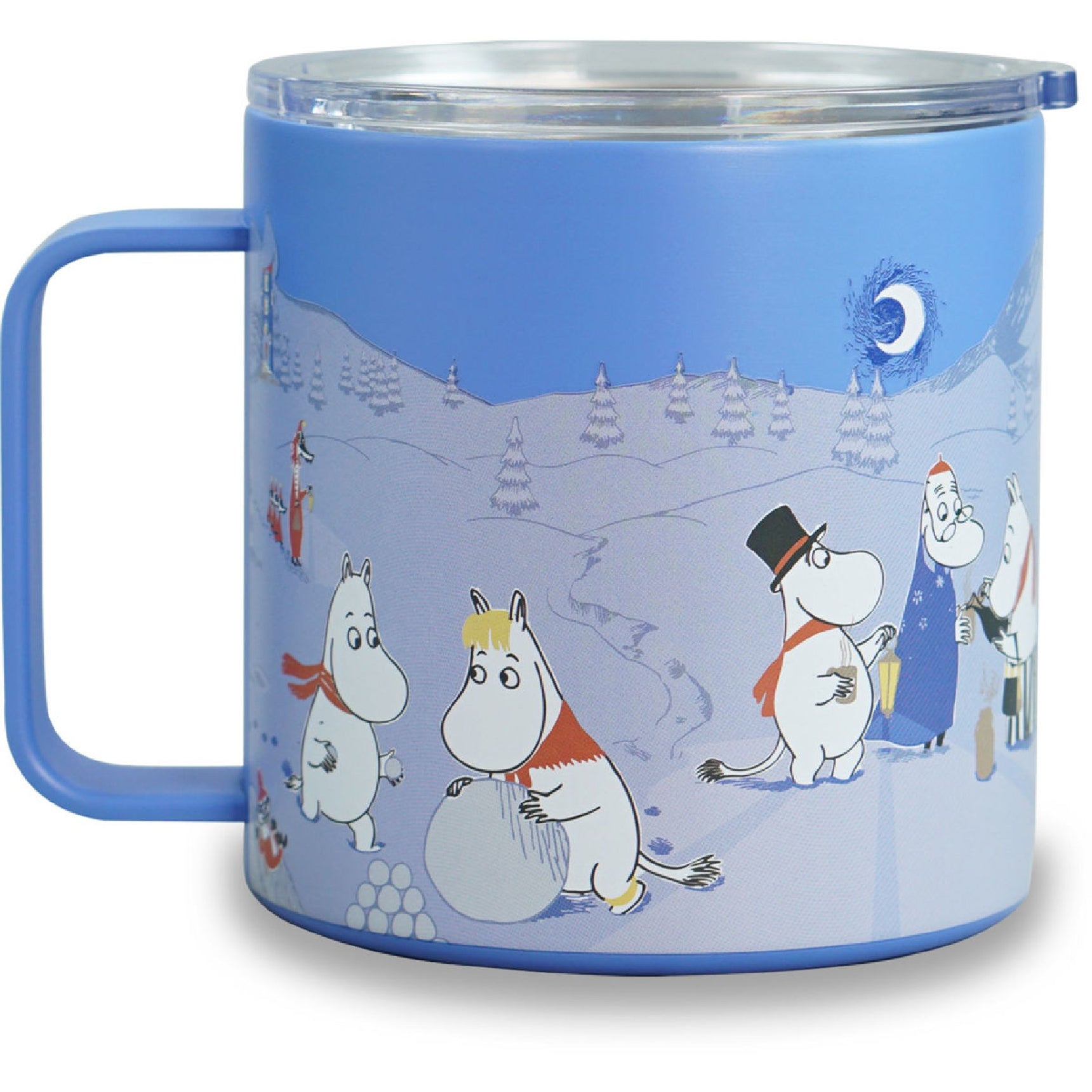 "The world was still and sparkly, like a dream come true." The Moomin family and friends are having a grand day out in the middle of winter, playing winter games and enjoying a hot drink. Make sure to carry your hot or cold drink on the go in this winter themed thermal take away mug with a practical handle. The mug holds 414 ml/14OZ. Made of stainless steel and has a secure flip sip lid. Measurements: Ø 10 cm, height: 10 cm