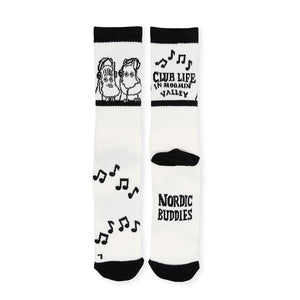 White and black-coloured socks Moomintroll size EU 40-45. Material 60% Cotton, 33% Polyester, 4% Nylon, 2% Elastane, 1% Elastodiene. Delicate wash 30 degrees.