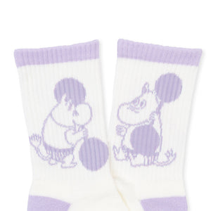 White and lilac -coloured socks Moomintroll, size EU 40-45. Material: 60% Cotton, 33% Polyester, 4% Nylon 2% Elastane, 1% Elastodiene. Delicate wash 30 degrees.