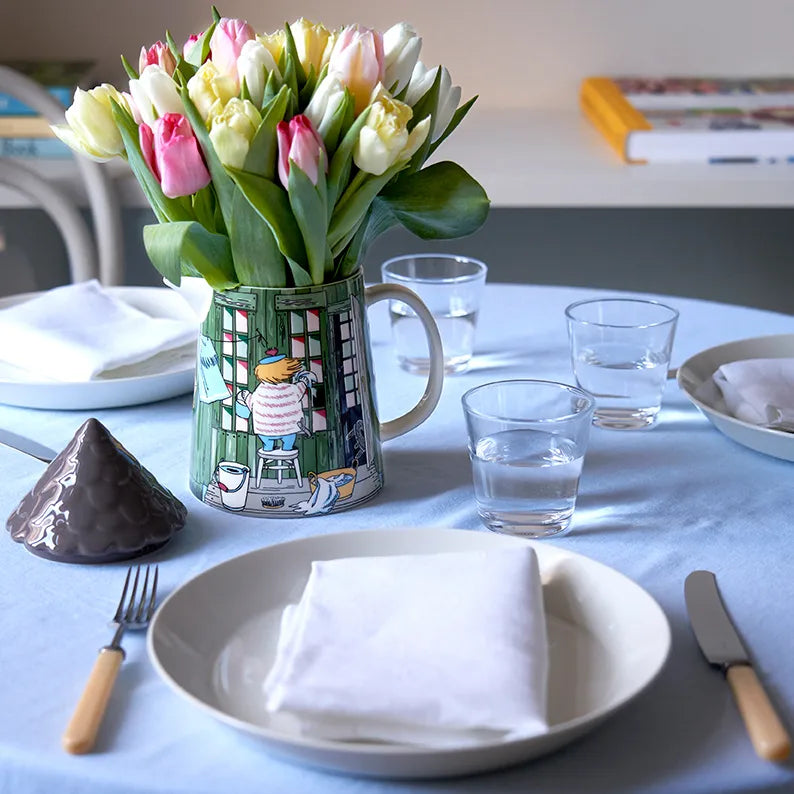 The Moomin bath house pitcher by Arabia features the loveable Moomin bath house. The Moomin bath house pitcher comes with a ceramic lid that keeps insects away from your drinks summer. This stylish and cool pitcher will definitely bring something to the dinner table with its beautiful colours!