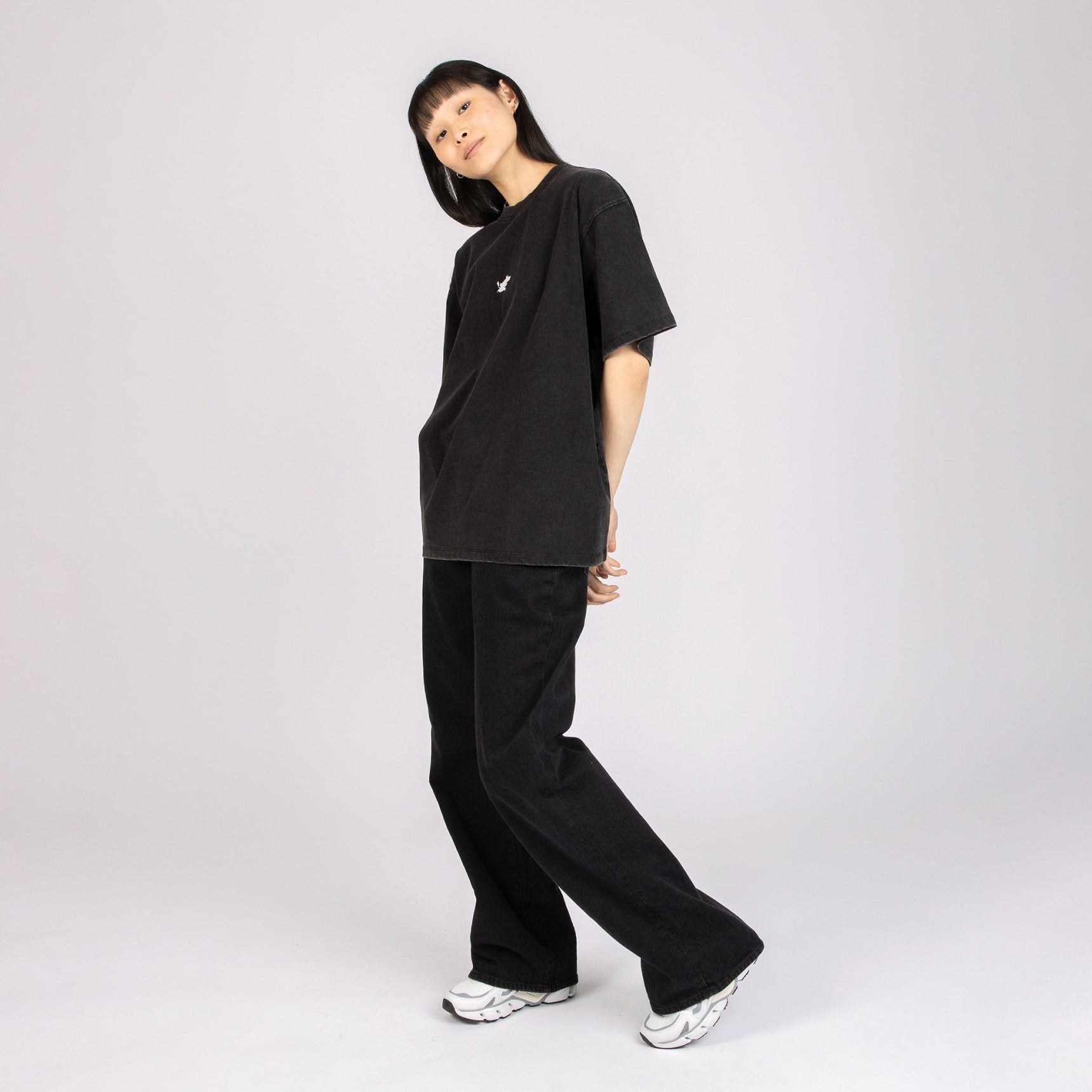 This cool dark stone washed black-coloured heavy cotton t-shirt features a small running Moomintroll on the front. Unisex model, box fit, we recommend ordering one size down. Perfect T-shirt to match with relaxed, casual jeans and a pair of sneakers!