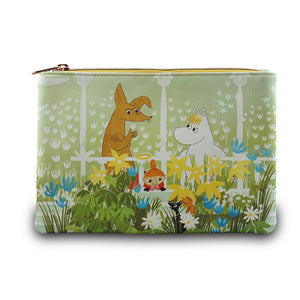 Pack your travel essentials in this fun cotton travel pouch. Featuring Moomin artwork in a soft pastel colour palette, this PU travel pouch captures a relaxed, summery balcony scene. Ideal for storing travel essentials, stationery, or everyday items.Made of thick recycled cotton and has a zip lock. Dimensions: 16 x 24 cm